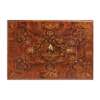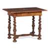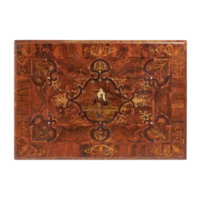 the rectangular top inlaid with C scrolls, flowers, and foliate scrolls, enclosing a central cartouche depicting Mary with the infant Christ and John the Baptist, above a long frieze drawer, raised on spiral carved legs joined by curved X form stretchers, on bun feet