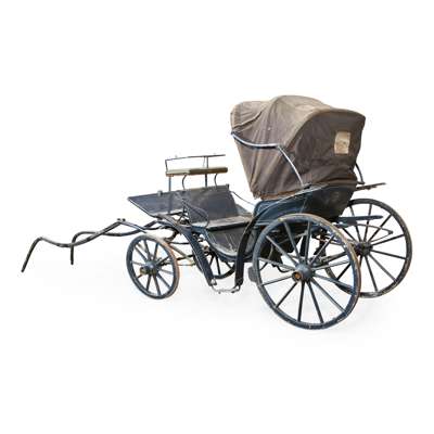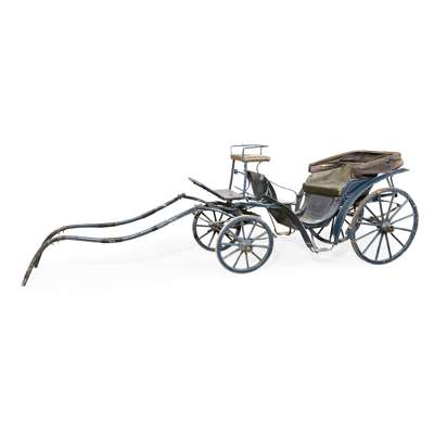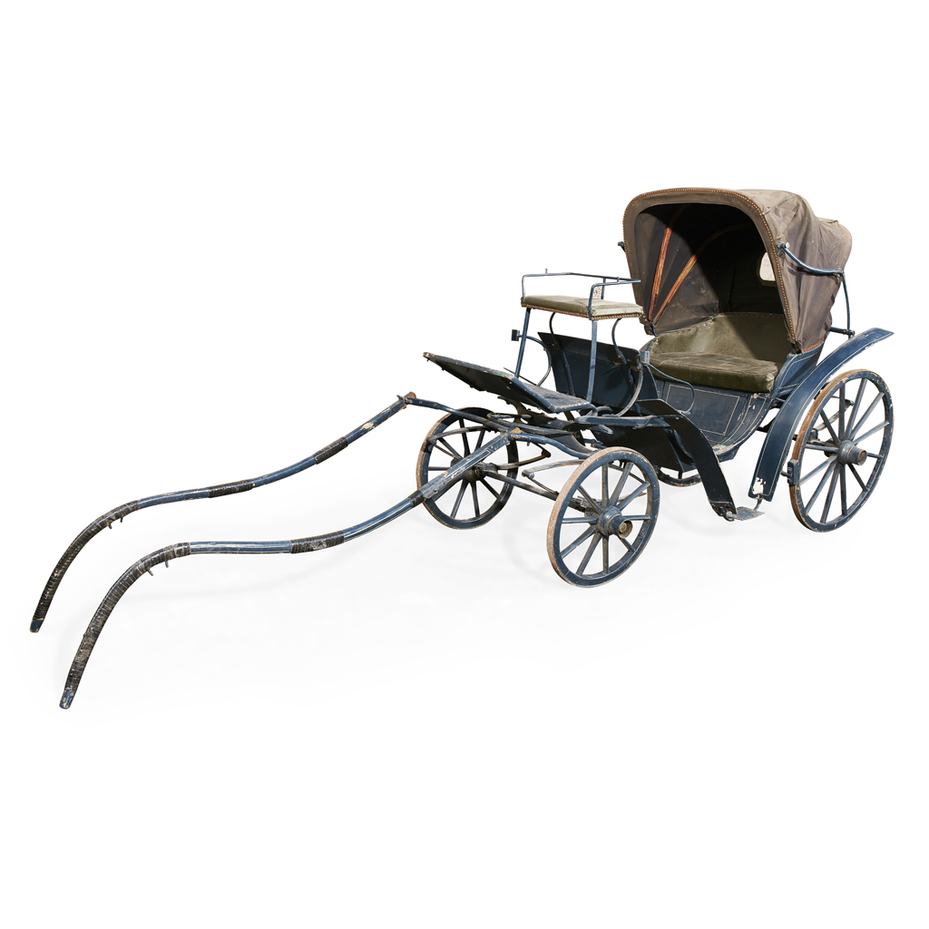 the blue painted chassis with a black canvas calash cover, the double seat and coachman seat upholstered in black vinyl, on English pattern wheels with elliptical suspension