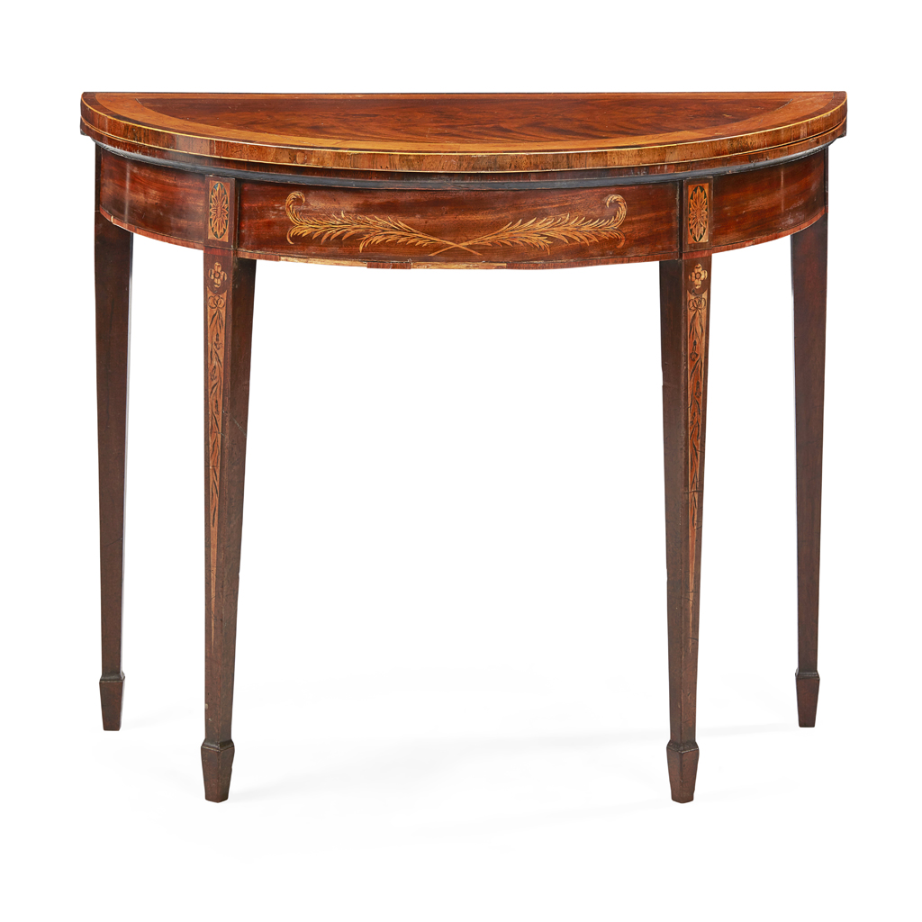GEORGE III MAHOGANY MARQUETRY DEMILUNE CARD TABLE