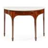 the dished white marble demilune top above a frieze inlaid with patera and husks, raised on square tapered legs inlaid with ribbon tied bellflower trails and ending in spade feet