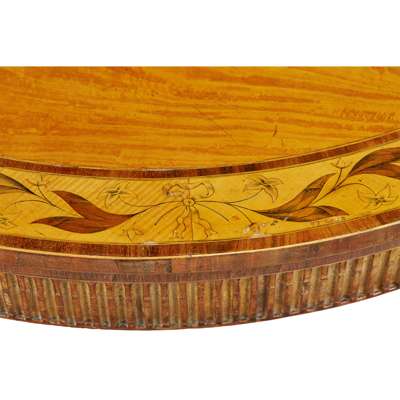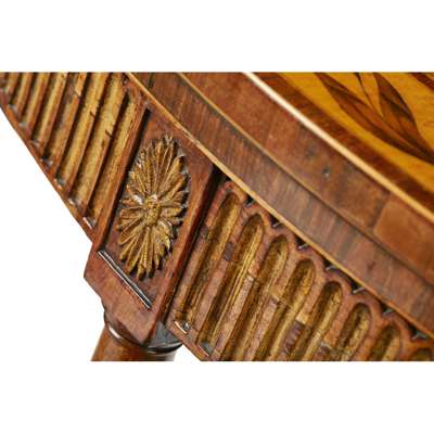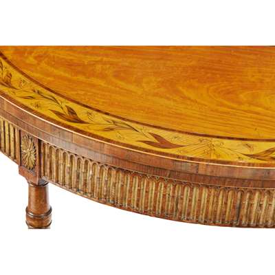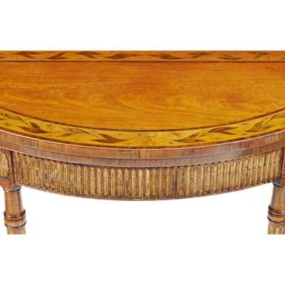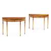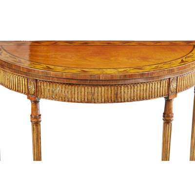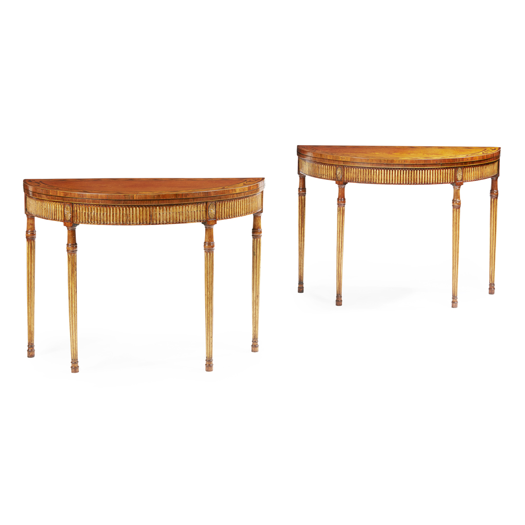 PAIR OF LATE GEORGE III SATINWOOD, PEARWOOD, KINGWOOD, PARCEL GILT AND MARQUETRY DEMILUNE CARD TABLES