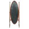 the oval bevelled mirror plate between square tapered and reeded supports with urn finials, raised on outswept trestle legs with brass caps and castors