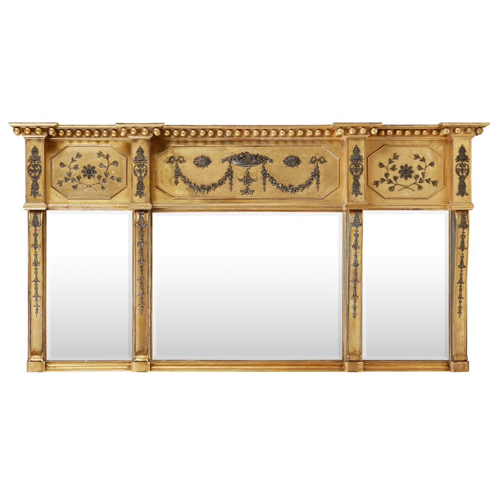 LARGE REGENCY GILTWOOD AND EBONISED TRIPLE PLATE OVERMANTEL MIRROR