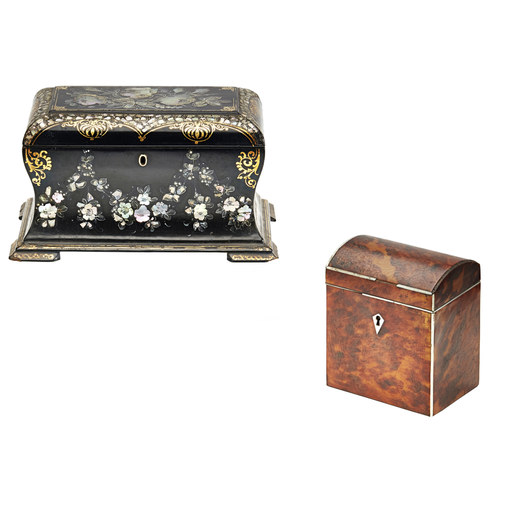 with ivory banded borders, the domed lid opening to a void interior, 9.5cm wide, 11cm high; together with a VICTORIAN PAPIER MACHE TEA CADDY, of waisted sarcophagus form, with mother-of-pearl inlay and gilt borders, the interior with two covered compartments, 25.5cm wide, 14cm high (2)