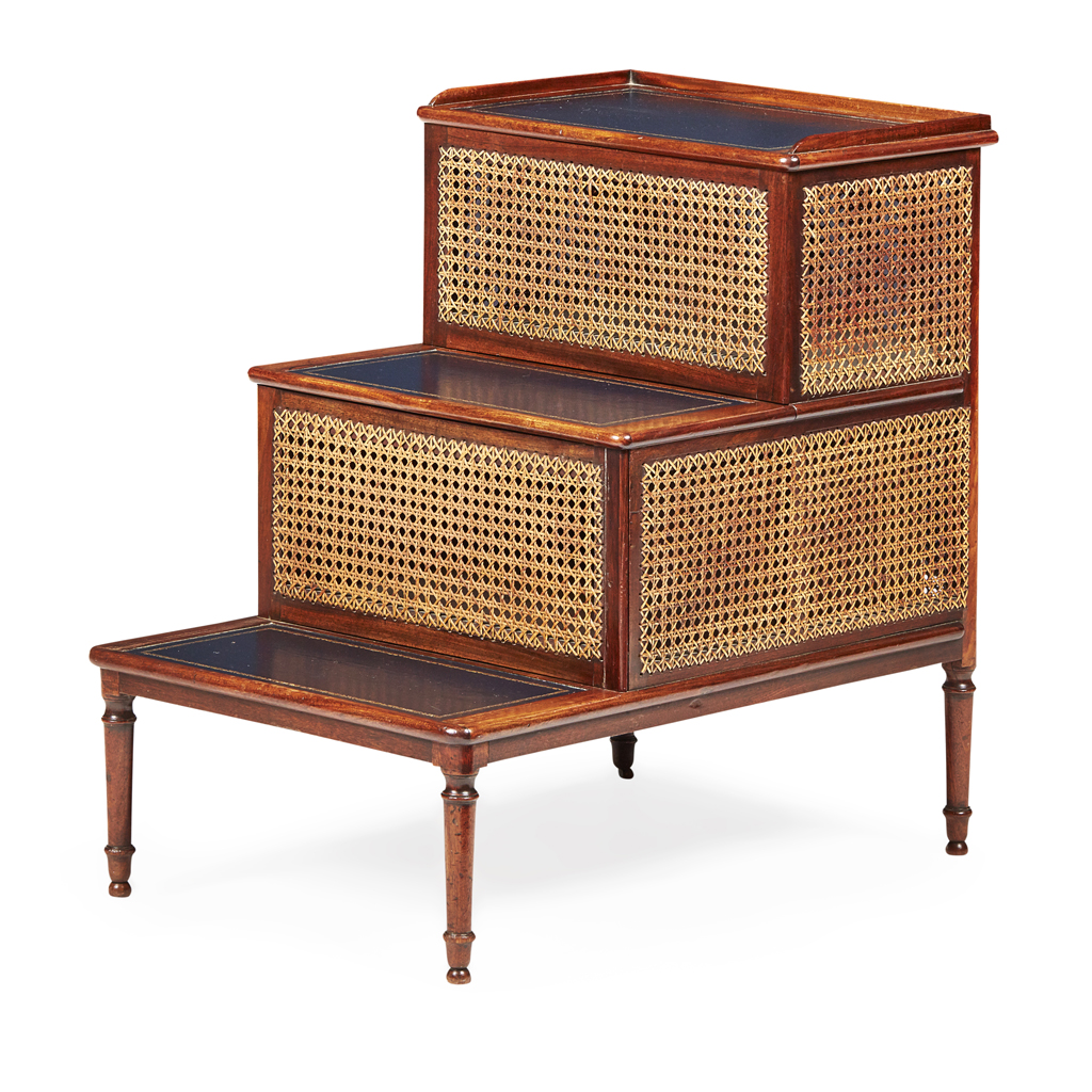 with three leather lined steps, two with hinged covers over caned side panels, raised on slender turned legs