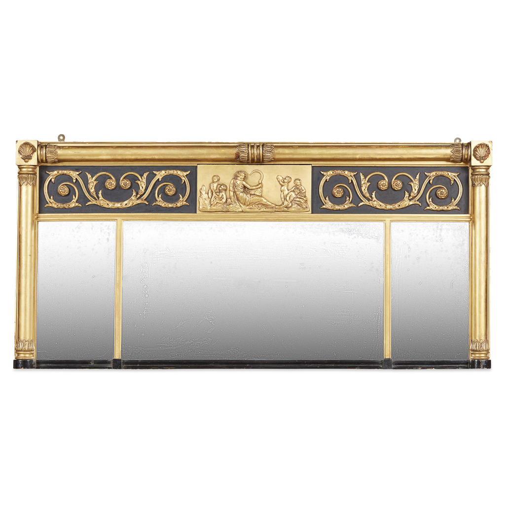REGENCY EBONISED AND GILTWOOD TRIPLE OVERMANTEL MIRROR