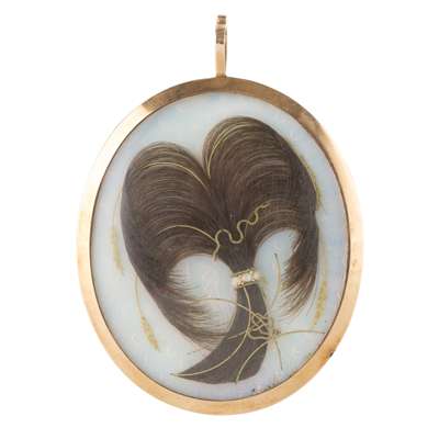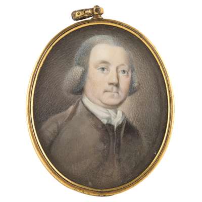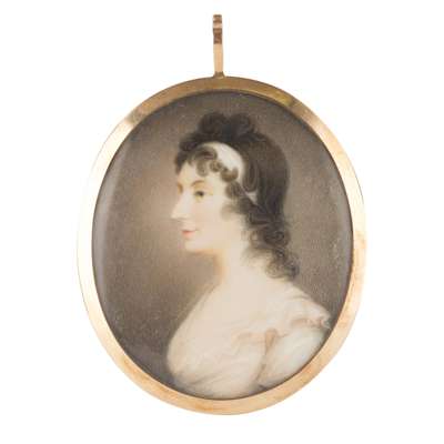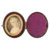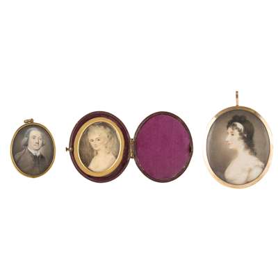 comprising an oval near profile portrait of a young lady, her dark hair tied with a scarf, in a pale pink muslin dress, the reverse with hairwork wheat stalks with seed pearls, 6.5cm high; an oval portrait of a gentleman wearing a powdered wig and dove grey coat with white tie, in a gilt metal locket frame, 4.5cm high; and an oval portrait on card of woman young woman with powdered hair and a pink gown, in a later leather case, 4.5cm high (3)