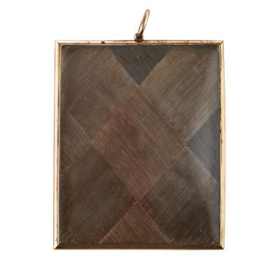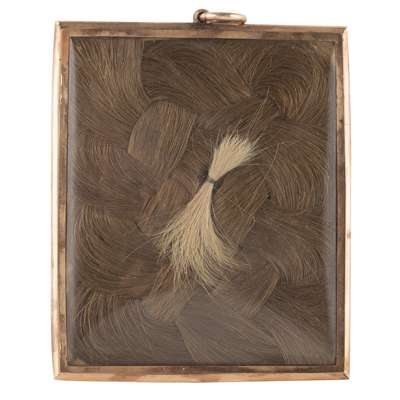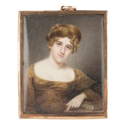 rectangular, he with grey hair, white neckscarf and a blue jacket, before a green curtain, the reverse with plaited hair; she with light brown hair and wearing a gold dress and black shawl, her arm resting on a book, signed 'CJ', the reverse with plaited hair (2)