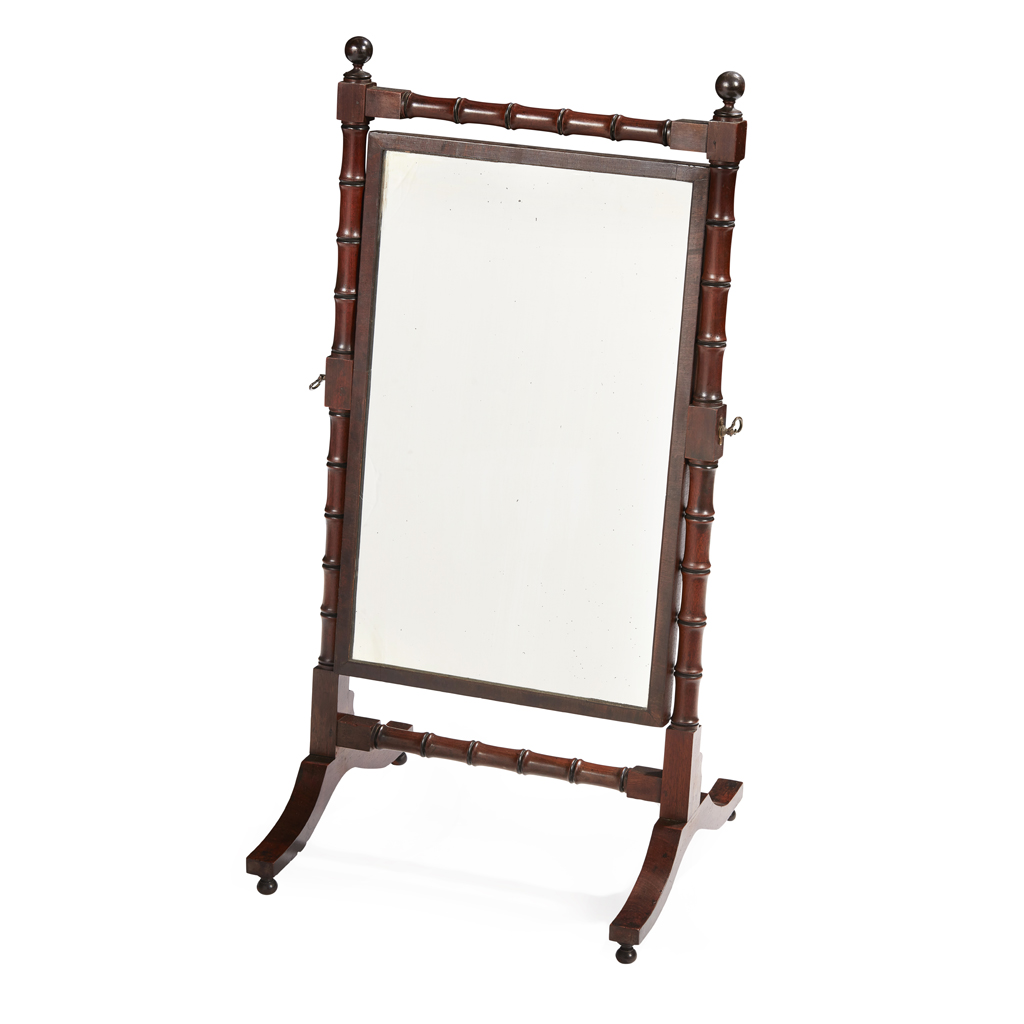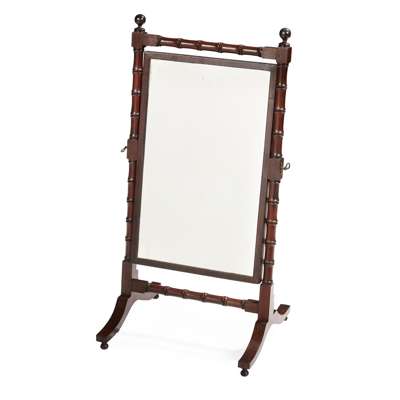 REGENCY MAHOGANY AND EBONISED DWARF CHEVAL MIRROR