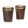 of tapered cylindrical form with spiral carved brass banded sides centred by carved shell panels, with brass liners (2)