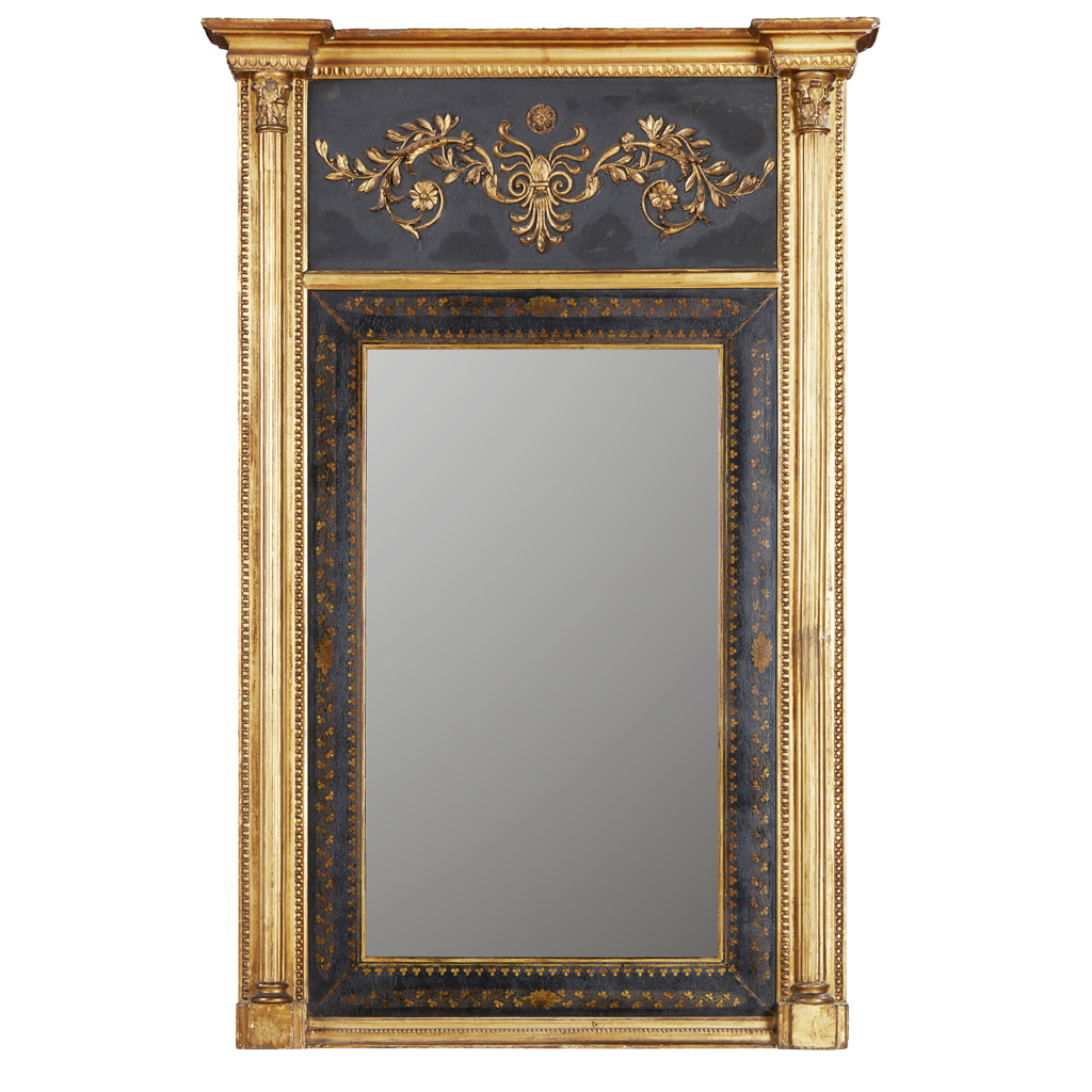 the inverted breakfront cornice above an ebonised frieze with foliate scrolls and anthemion, above a rectangular mirror plate in a wide ebonised and gilt decorated slip flanked by fluted Corinthian pilasters