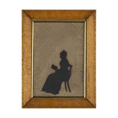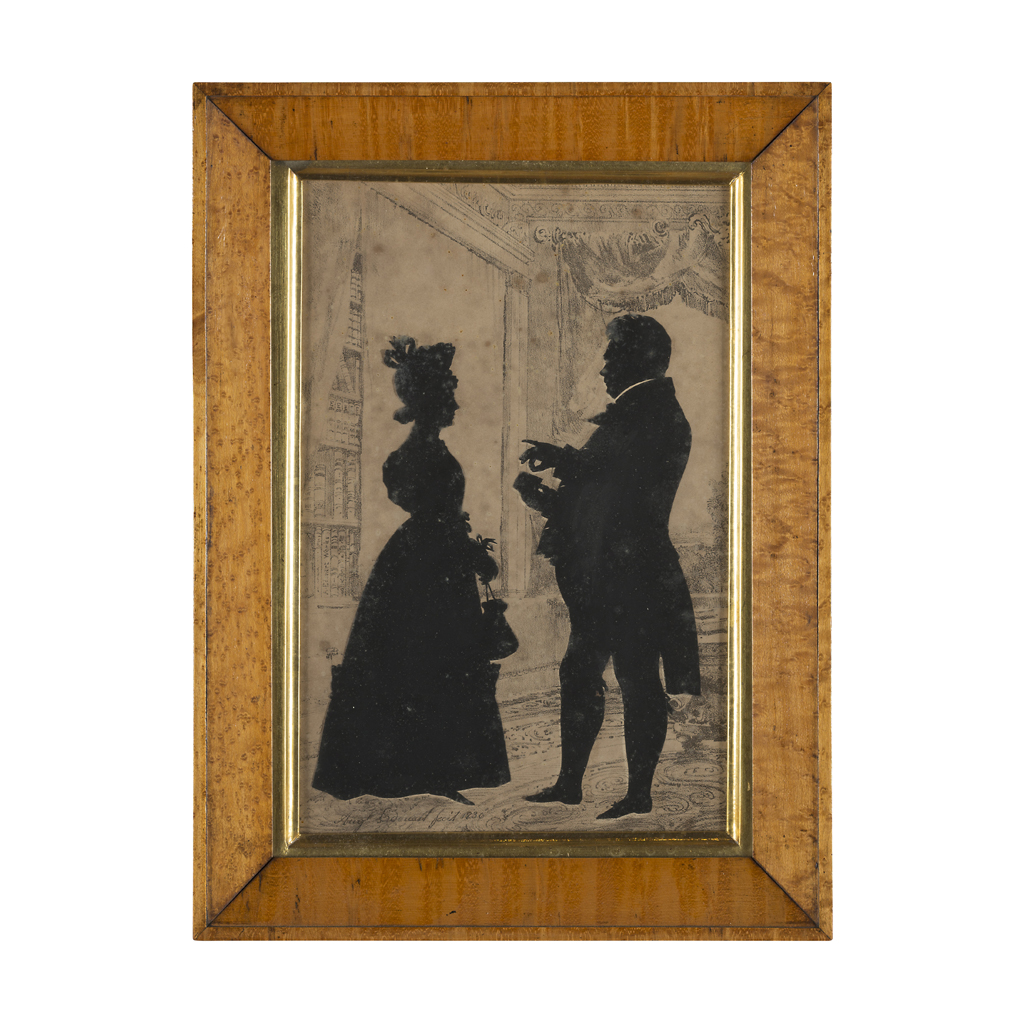 comprising cut paper figures of Rev. Dickson taking snuff attended by his wife, in a sepia wash and pencil drawing room interior, signed AUG.ST EDOUART FECIT 1830, 27 x 18cm; and a cut paper figure of Mrs. Dickson seated and reading, in a sepia wash and pencil room interior, signed AU EDOUART FECIT 1830, 27 x 18cm; in bird's eye maple frames with handwritten family history verso (2)