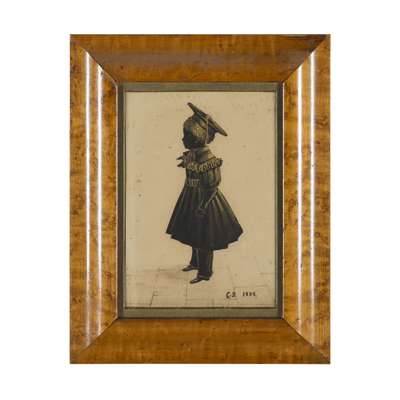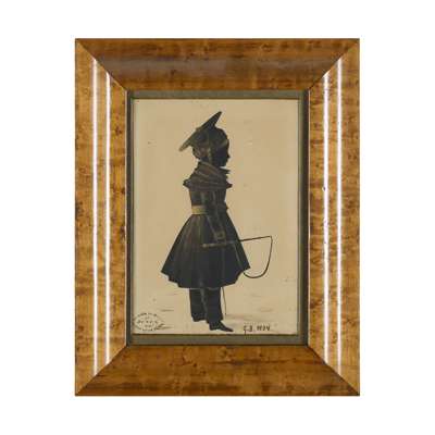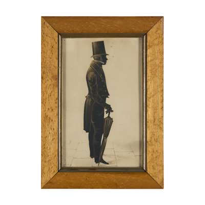 comprising a cut paper figure of Robert Bruce (1787-1851), with a top hat and umbrella, 27 x 16.5cm; a cut paper figure of Charles Bruce, age four, marked and dated C.B. 1834, 19 x 13cm; and a cut paper figure of George Bruce, age five, marked and dated G.B. 1834, and stamped 'Art with Scissors at Jones' Gallery of Arts', 19 x 13cm; all heightened with gilt, in maple frames, the subjects identified verso (3)