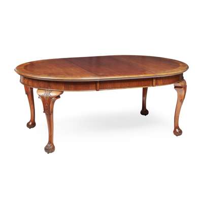 the oval crossbanded top with three leaf extensions, raised on foliate carved cabriole legs