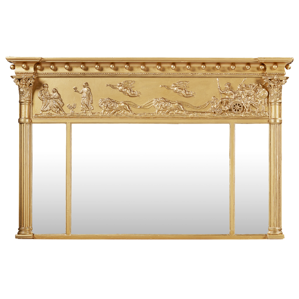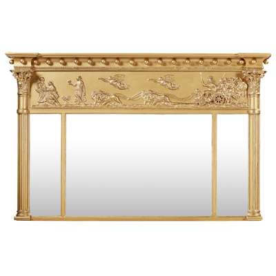 the moulded cornice with ball mounts above a frieze with a relief scene depicting Apollo in his chariot, above triple bevelled mirror plates flanked by reeded Corinthian pilasters