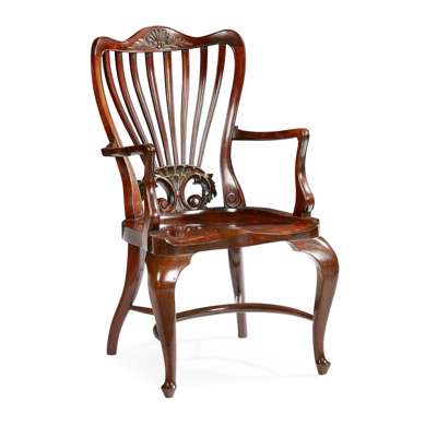 the curved and arched slatted back carved with shells above a shaped seat and scrolled arms, raised on cabriole legs joined by a curved stretcher and ending in pad feet