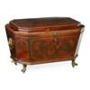 of octagonal sarcophagus form with a hinged cover and a lead lined compartmented interior, the sides with lion mask brass handles, raised on brass hairy paw feet with castors