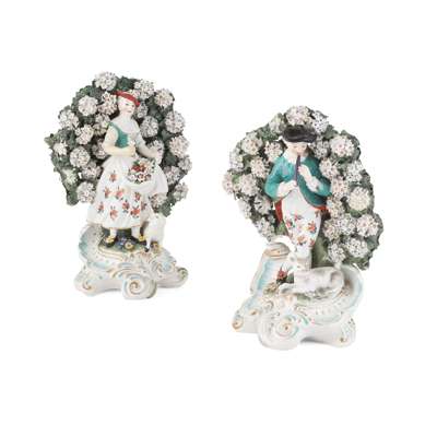 modelled as a shepherd and shepherdess, he playing a recorder with a dog at his feet, she with flowers gathered in her skirt, a lamb at her feet, against bocage and raised on rococo scrolled bases, anchor marks (2)