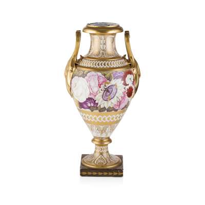 with an everted neck and baluster body with twin handles, painted with flowers within gilt borders, raised on a socle foot and square base