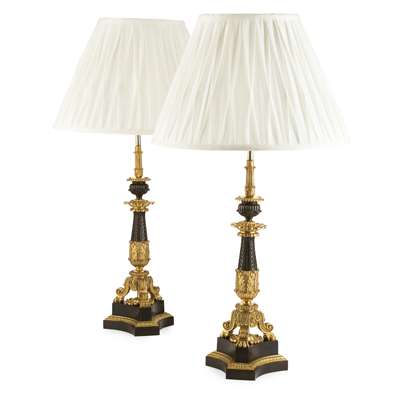 PAIR OF REGENCY GILT AND PATINATED BRONZE TRIFORM LAMPS