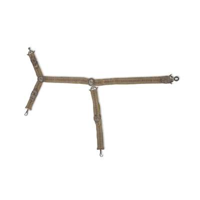 the iron hilt with birds head pommel, shaped knuckle guard from the forward cross guard terminal joining the beaked pommel in a leaf spray, remains of koftgari work, earlier slender watered steel Sind curved single edge Damascus blade with long gold inscription on both sides of the blade, translated 'Sword of Akbar, presented to Major Robert McPherson by the King of Delhi for his dedicated service to His Majesty Akbar 1817', the wooden scabbard with two steel hanger mounts and steel chape, faded green velvet cover embroidered with panels of scroll work with its matching sword belt in the European manner, comprising of a buckle of Meena work inset with dark blue and green enamel and a series of enamel white metal mounts with flower heads of blue enamel, of a type from Jaipur, the belt material of faded embroidered cloth with lozenge decoration throughout its length