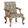 the square padded back above serpentine part-padded arms ending in scroll carved hand holds and supports, over a wide seat raised on acanthus and C-scroll carved cabriole legs ending in raised scroll feet, in black and gold foliate upholstery