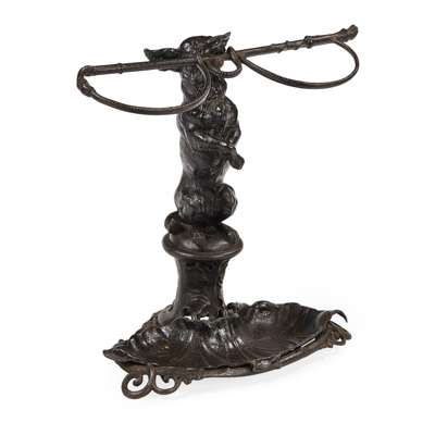in the form of a seated terrier with a whip in its mouth, over a leaf form drip pan; painted black