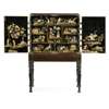 the doors with engraved brass hinges and escutcheon, opening to an arrangement of drawers, decorated allover in polychrome and gilt gesso with exotic figures, birds, and landscape views; the later stained mahogany stand with ring turned tapered legs