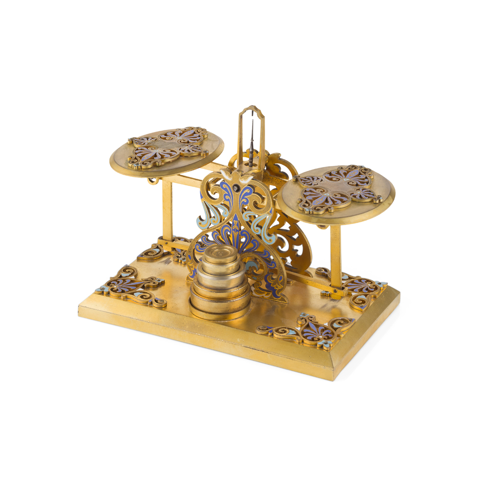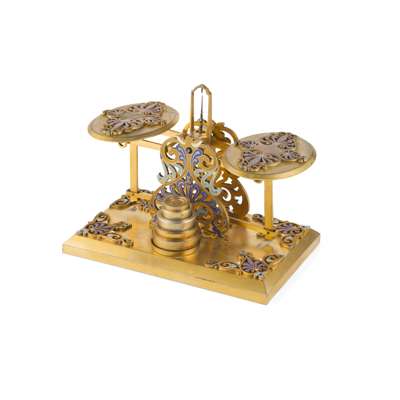 PAIR OF VICTORIAN GILT BRASS AND ENAMEL TABLE SCALES