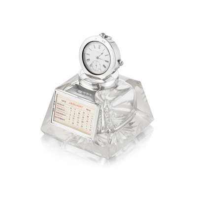 the swivel action cover containing a white metal pocket watch signed 'John Walker, 18904', above a tapered cubic glass inkwell with star cut base mounted with a silver frame with calendar month cards