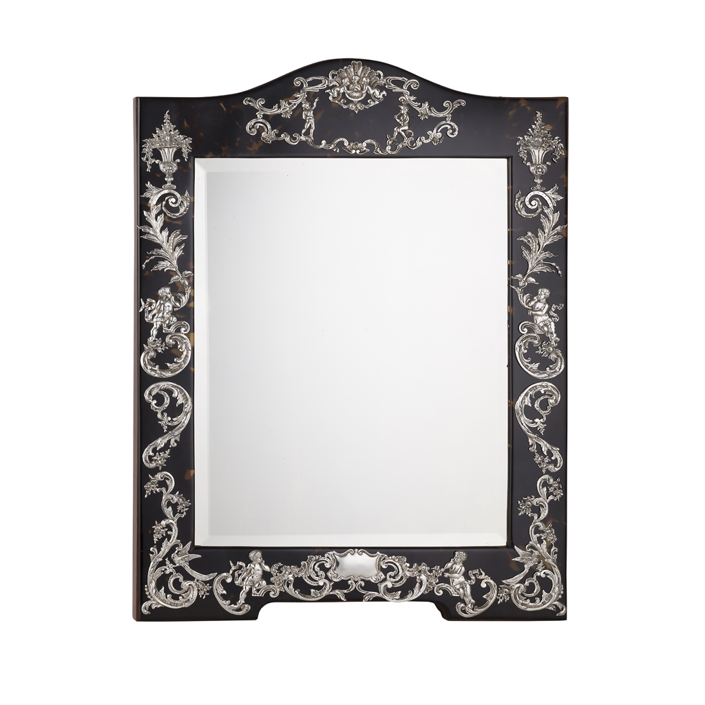 the rectangular bevelled mirror plate in a wide tortoiseshell arch top frame with pierced Rococo style silver mounts depicting putti, flowering urns, birds and a vacant cartouche, on a mahogany back with easel support bearing retailer's label 'MACMICHAEL/ 42 SOUTH AUDLEY ST/ LONDON'; and maker's mark 'JB'