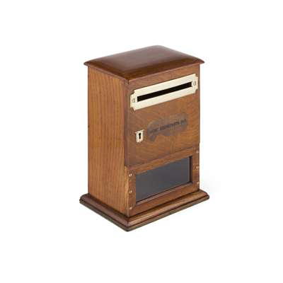 of upright rectangular form with a domed top over a hinged door with brass post slot and glass front compartment on a moulded base