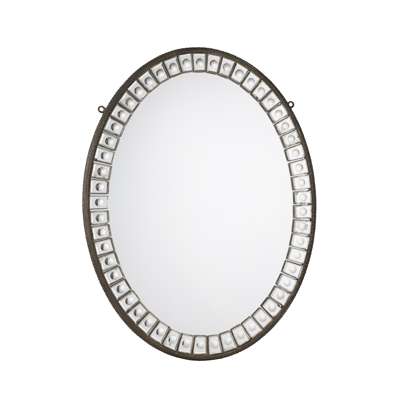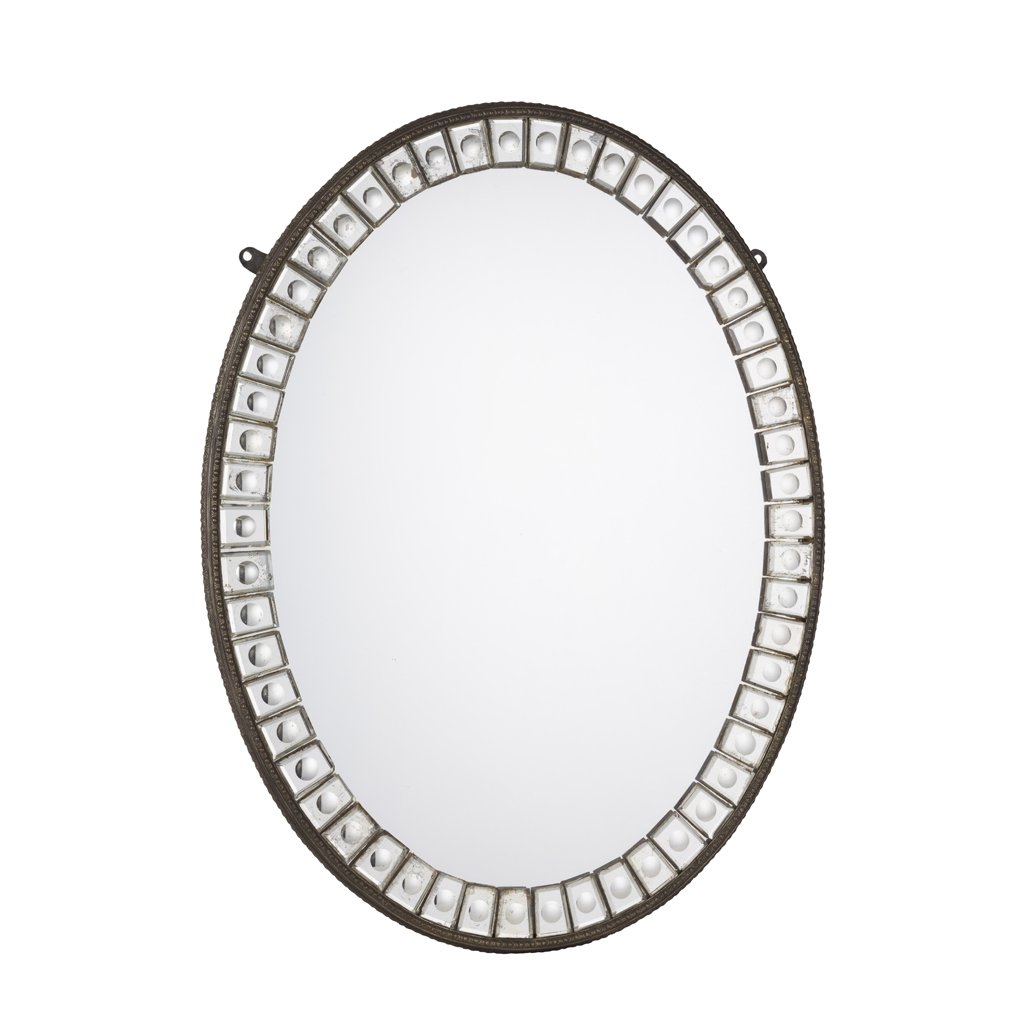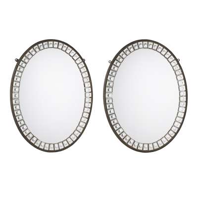 the oval mirror plates banded with bevelled and convex cut mirror glass panels, in relief cast metal frames (2)