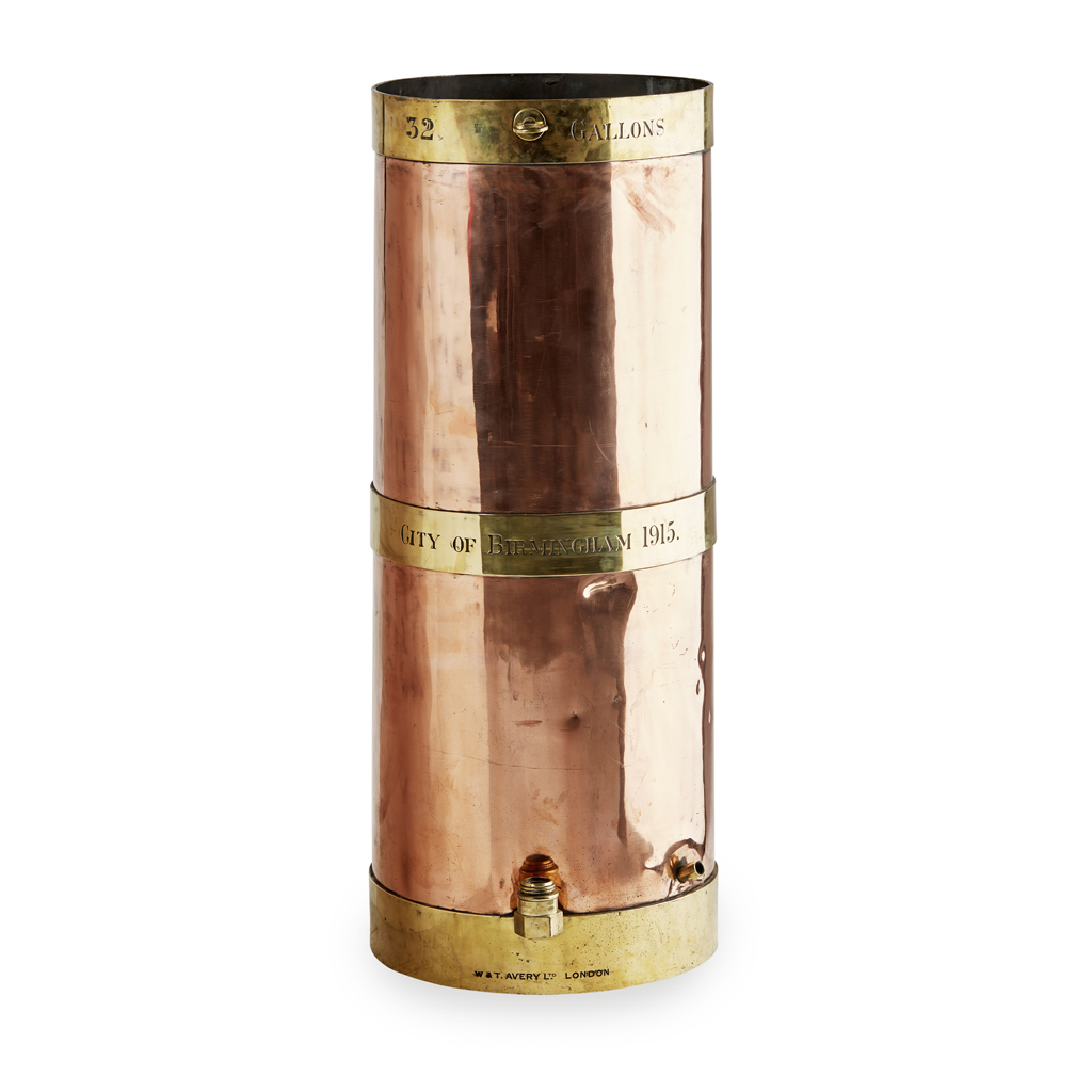of cylindrical form, the copper body with brass bands engraved '32 GALLONS / CITY OF BIRMINGHAM 1915 / W & T AVERY LTD LONDON'