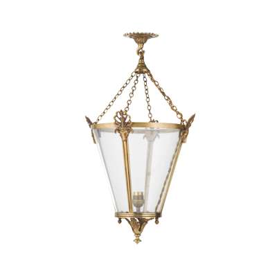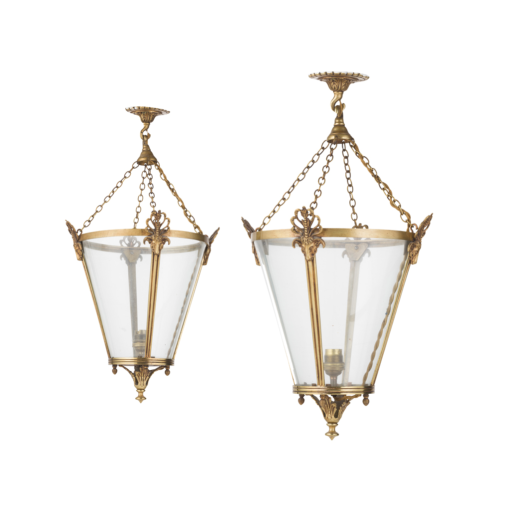 the four-glass tapered bodies suspended by chains and mounted with rams' masks and anthemia, terminating in acanthus pendant finials (2)