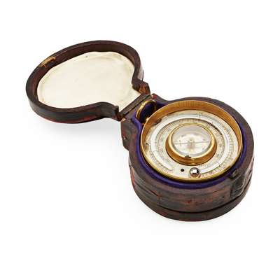 with an adjustable aneroid barometer to one side, reading 0' to 10,000', and a mercury thermometer, and a 1" compass on the reverse side, marked COMPENSATED/ MADE IN ENGLAND, in a leather case