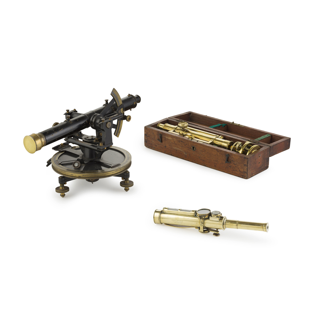marked JAMES LESLIE. C. E./ 72A GEORGE STREET/ EDINBURGH, in a leather pouch, tube length 26cm long; together with a further BOXED BRASS SURVEYING LEVEL, SIGNED J. BROWN, 76 ST. VINCENT ST./ GLASGOW, late 19th century, with a four screw tripod mounting, tube length 25cm long, overall height 13cm high; and a BLACK-ENAMELLED BRASS SURVEYING THEODOLITE, SIGNED TROUGHTON & SIMMS, LONDON, 19th century, telescope length 38cm long, overall height 25cm high (3)