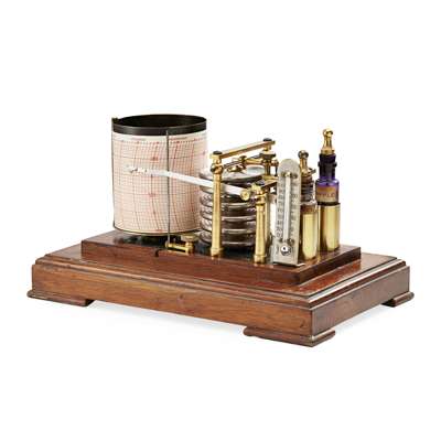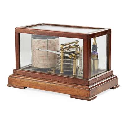 with brass instruments, six ring atmosphere drum, thermometer and ink vials, in a glazed case