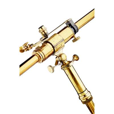 signed and with an inscription, to opposing sides, 39cm high; together with a BRASS SPECTROSCOPE, BY JOHN BROWNING, LONDON, signed to the base, 43.5cm high; and a FRENCH BRASS AND CAST IRON PRISM STAND, signed E. DUCRETET/ A PARIS, fitted with a prism block, 35.5cm high (3)