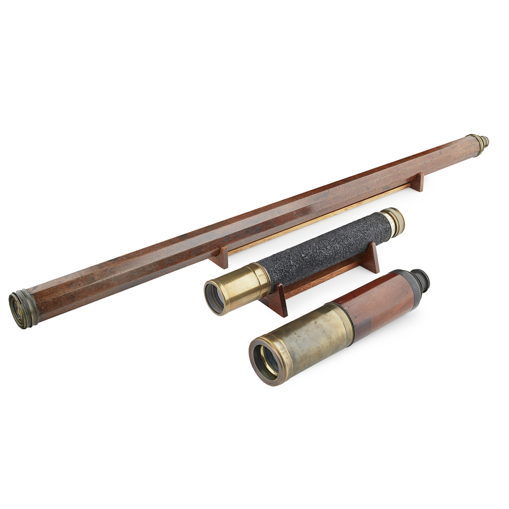 with a facetted mahogany barrel, single draw, unnamed, on a table top support, 96.5cm long; together with a MAHOGANY AND BRASS TELESCOPE, BY G. WILLSON, LONDON, with a mahogany barrel, three draw, signed G. WILLSON LONDON/ IMPROV'D DAY OR NIGHT, 95cm long (extended), 28.5cm long (closed); and a POLISHED AND PATINATED BRASS TELESCOPE, on a table top support, 34.5cm long (3)