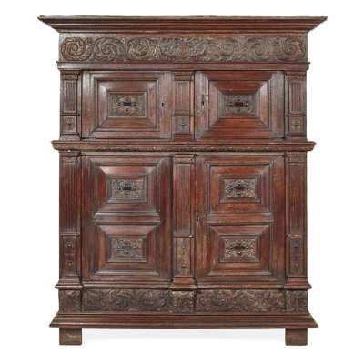 the projecting cornice above a deep frieze carved with foliate scrolls and birds above a pair of cupboard doors with ebony inlay, the lower section with two further cupboard doors, flanked and divided by fluted pilasters, the base carved with scrolling foliage and birds, raised on stile feet
