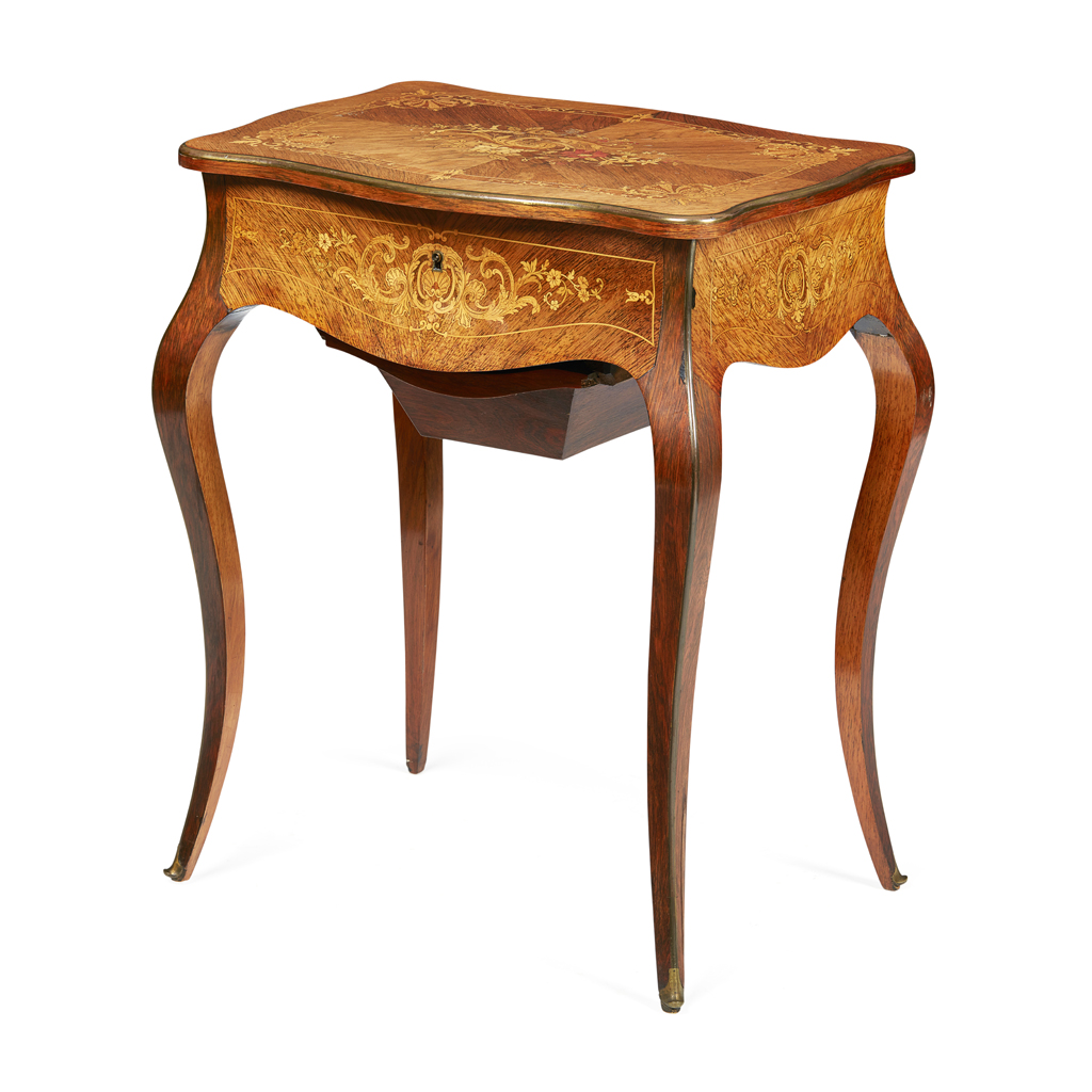 FRENCH KINGWOOD ROSEWOOD AND MARQUETRY WORK TABLE
