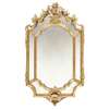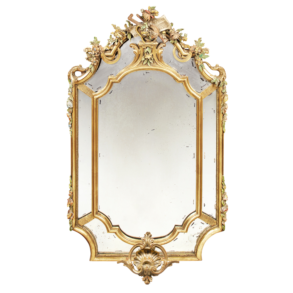 the shaped mirror plate within conforming margin plates, the moulded frame with flower garlands and surmounted by a musical trophy