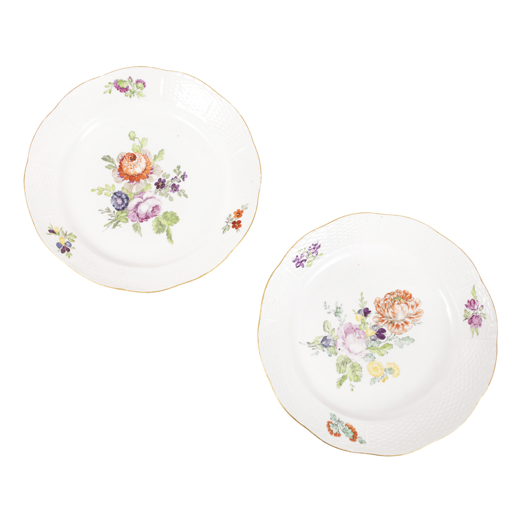 each plate with a basket weave moulded border decorated with three flower sprigs, enclosing a flower spray, with gilt rim, Imperial cipher of Catherine the Great and incised numerals (2)