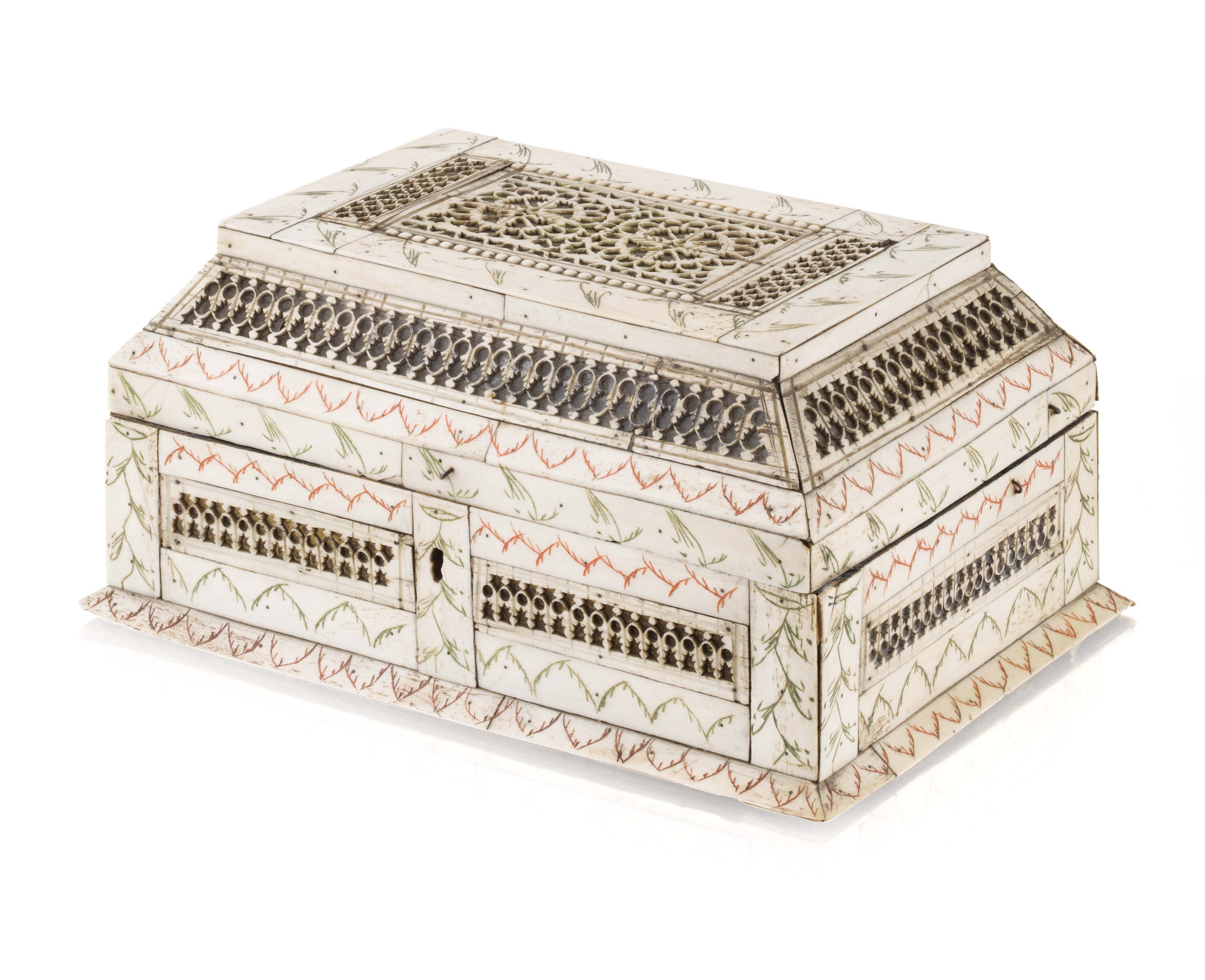 the rectangular box with pierced fretwork panels and carved veneers with red and green stained engraved borders