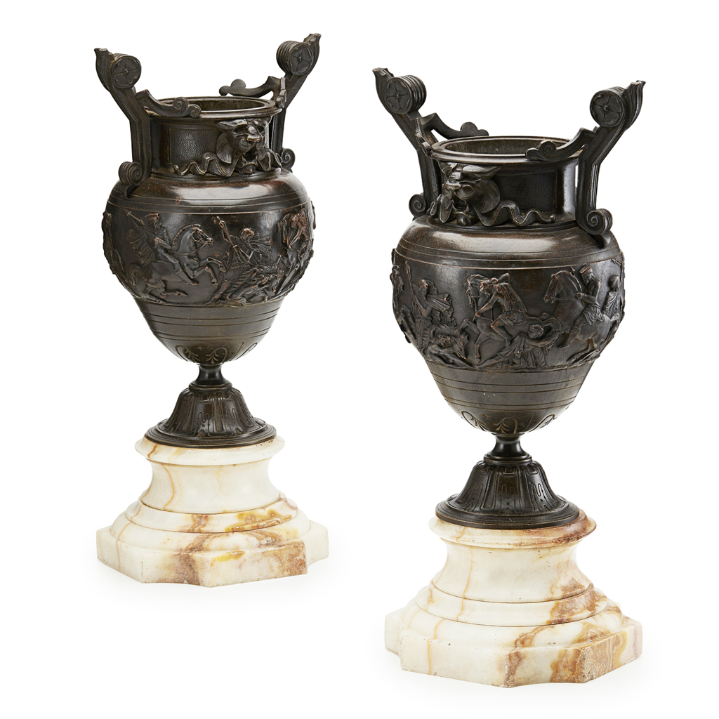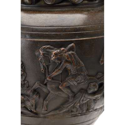 with volute handles, the bodies with a continuous relief depicting Meleager and Atlanta engaged in boar hunt, on a waisted onyx pedestal base (2)