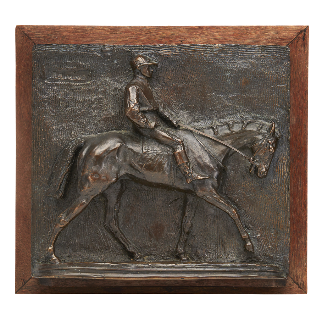BRONZE RELIEF MAQUETTE OF A HORSE AND JOCKEY