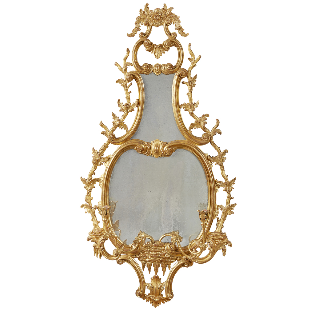the shaped oval mirror plate surmounted by a second waisted mirror plate in a C-scroll and foliate openwork frame issuing a pair of scrolling candle arms with flower head candle holders