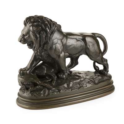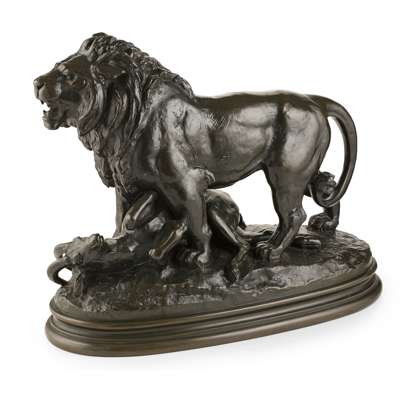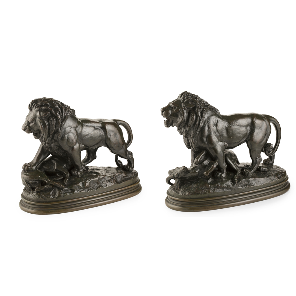 green/brown patina, one standing over an antelope, the other over a boar, on naturalistic oval bases, signed BARYE (2)