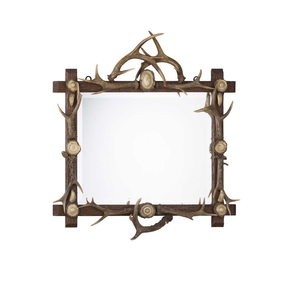 the rectangular bevelled mirror plate in a carved wood frame mounted with antlers and carved sectional antler roundels